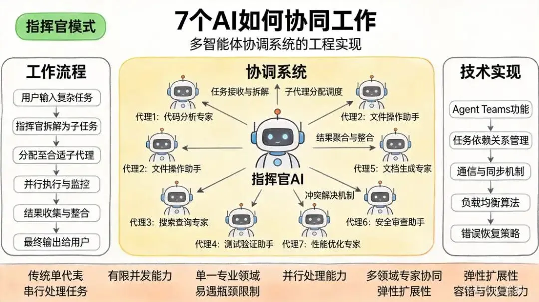 多智能体协调系统的核心是“管理者–工作者”分层结构,通过任务分解、冲突解决、结果聚合,实现多Agent协同增效。源码中最惊艳的设计是原生多Agent架构:收到复杂任务(如“重构整个项目+写测试+补注释”),自动拆成多个子Agent并行工。