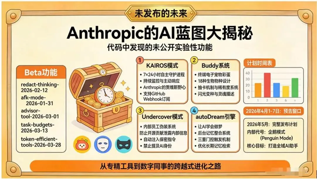 核心发现:泄露代码不仅暴露了现有功能,更揭示了Anthropic未来的产品路线图和战略意图。KAIROS模式展示了其打造“全域AI助手”的野心,而Undercover Mode则反映了公司在商业机密保护与开源透明度之间的权衡困境。 |