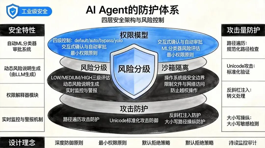 Claude Code的安全设计体现了Anthropic“安全优先”的设计哲学,包括六级权限验证、沙箱隔离、攻击防御(路径遍历、Unicode标准化防护)、权限解释器(LLM生成风险说明)。内置操作系统级沙箱隔离(@anthropic-ai/sandbox-runtime),限制文件与网络访问,采用动态权限检查和风险分级。