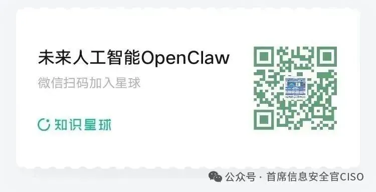 温馨提示:请通过”扫码”加入星球,获取更多OpenClaw资料,更多(网络信息安全、商业秘密保护、IT审计、安全与认证培训、AI新技术、自媒体等等…)资料合集。 ![]() |