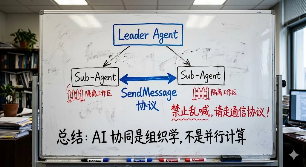TEAMMATE_SYSTEM_PROMPT_ADDENDUM 里有句很硬的话:如果你只是输出普通文本,团队里的其他 agent 是看不到的,你必须用 SendMessage 才能通信。