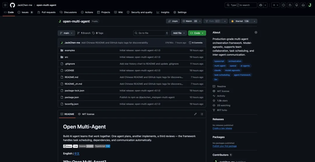 AI 帮我写 README,直接用了 npm install open-multi-agent。