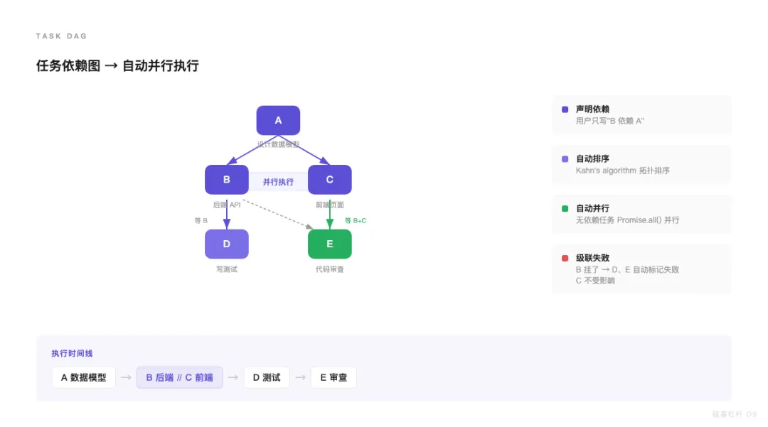 执行顺序自动算出来:A 先做 → B 和 C 并行 → D 等 B → E 等 B 和 C 都完成。