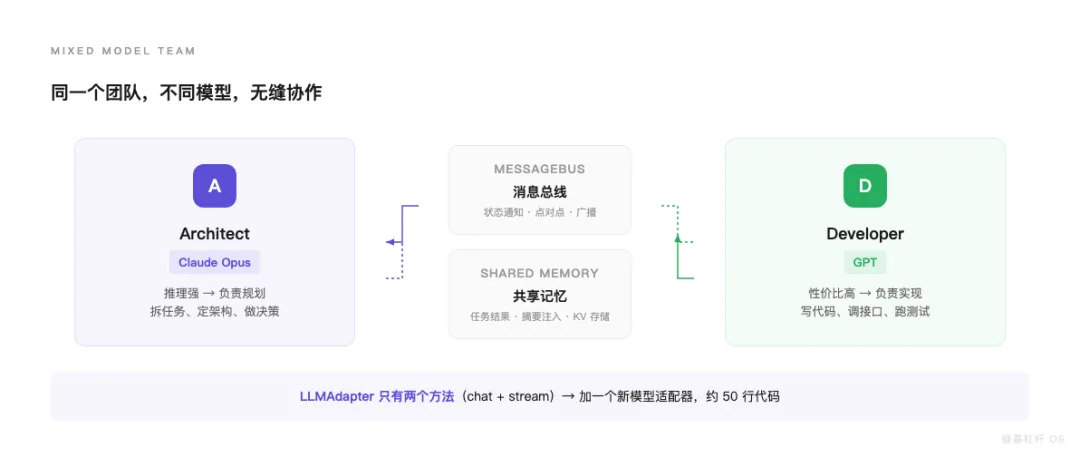 Architect 用 Claude Opus 做规划。Developer 用 GPT 写实现。共享 MessageBus 和 SharedMemory,无缝协作。