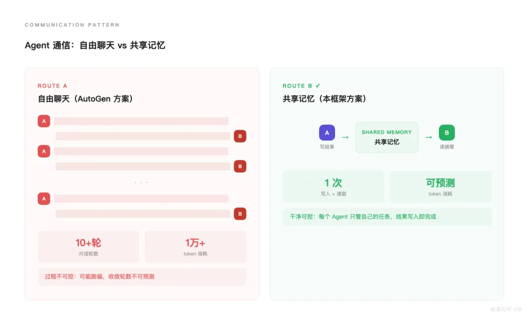 两个 Agent 来回 10 轮,轻松上万 token。而且过程不可控——你不知道它们会不会聊跑偏,也不知道要聊多少轮。
