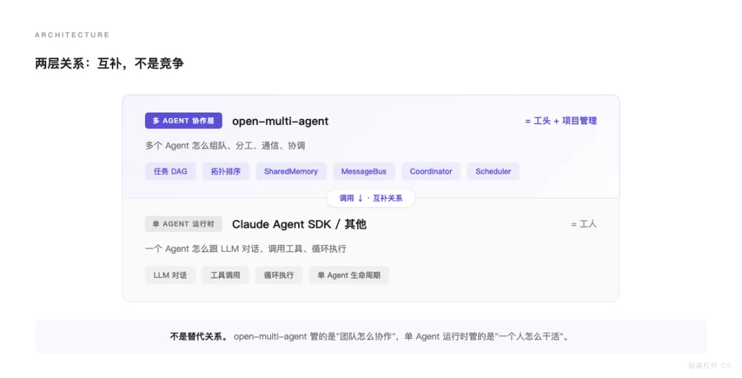 翻译成人话:Claude Agent SDK 是工人,open-multi-agent 是工头 + 项目管理系统。 互补关系,不是竞争。
