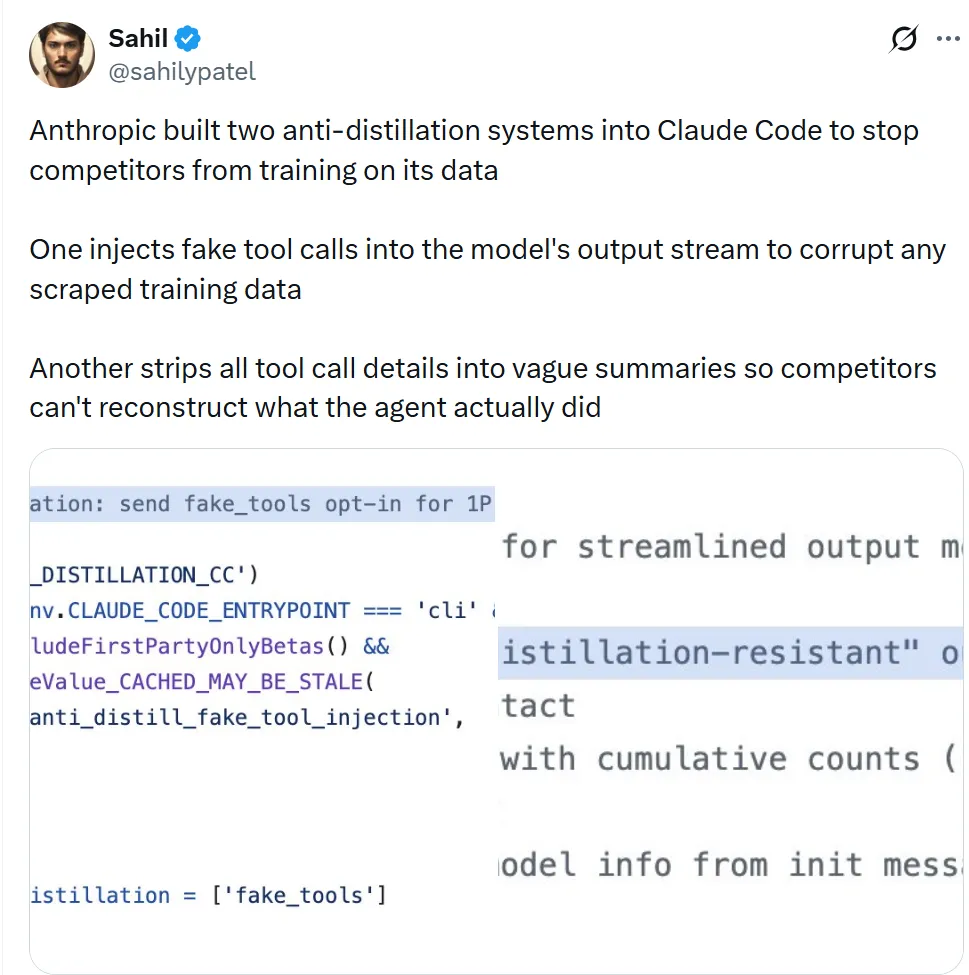 X 用户 Sahil 发现:Anthropic 在 Claude Code 中内置了两套反蒸馏机制,用于防止竞争对手利用其数据进行训练。
