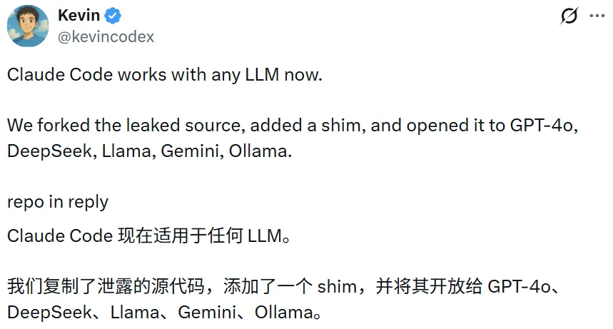 而 X 用户则添加了一个 shim,将 Claude Code 开放给了各种第三方模型和服务: