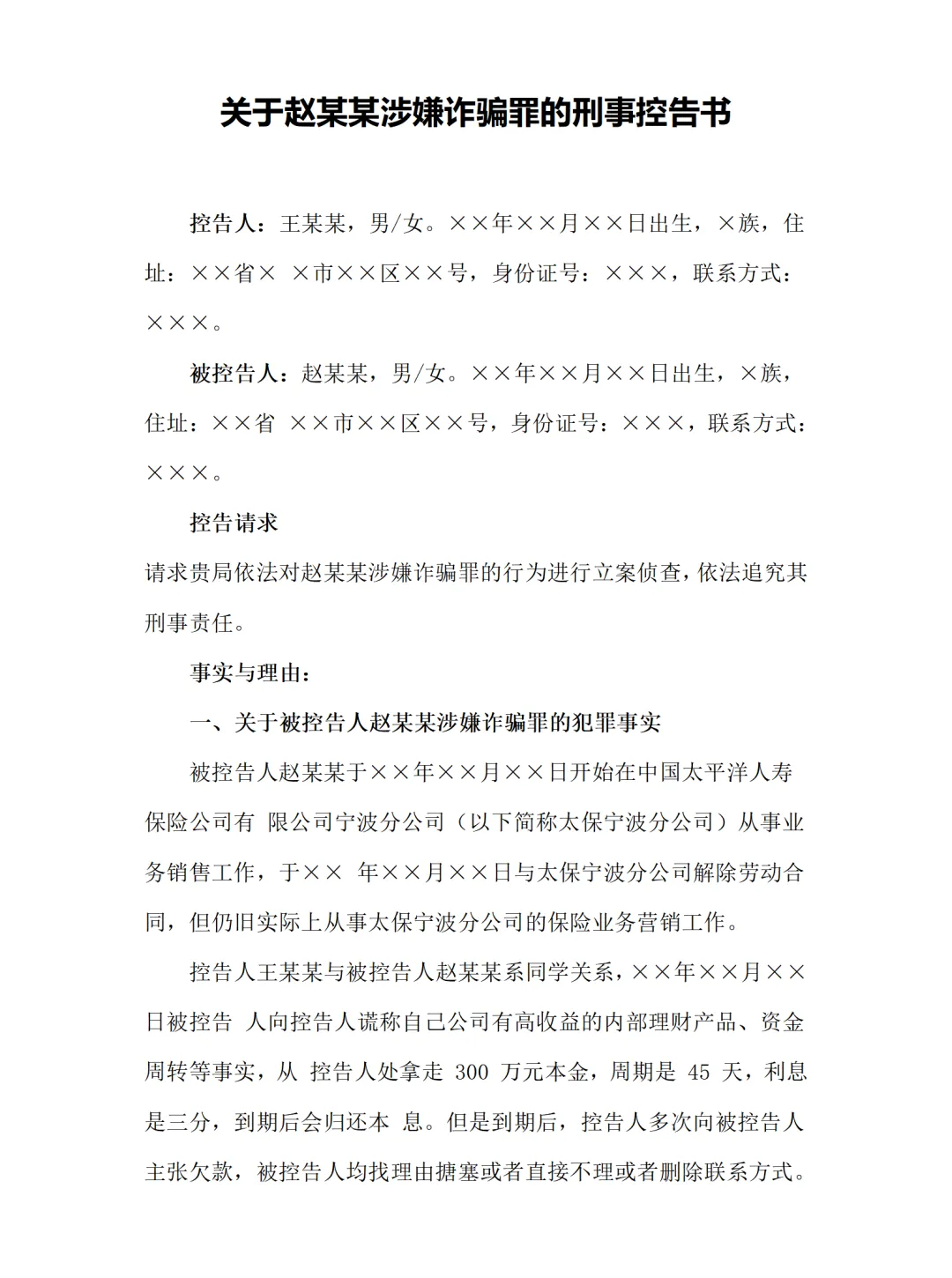 【免费下载】涉嫌诈骗罪的刑事控告书(实用范本).docx