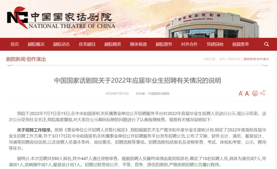 7月16日,中国国家话剧院发布《中国国家话剧院关于2022年应届毕业生招聘有关情况的说明》,全文如下: