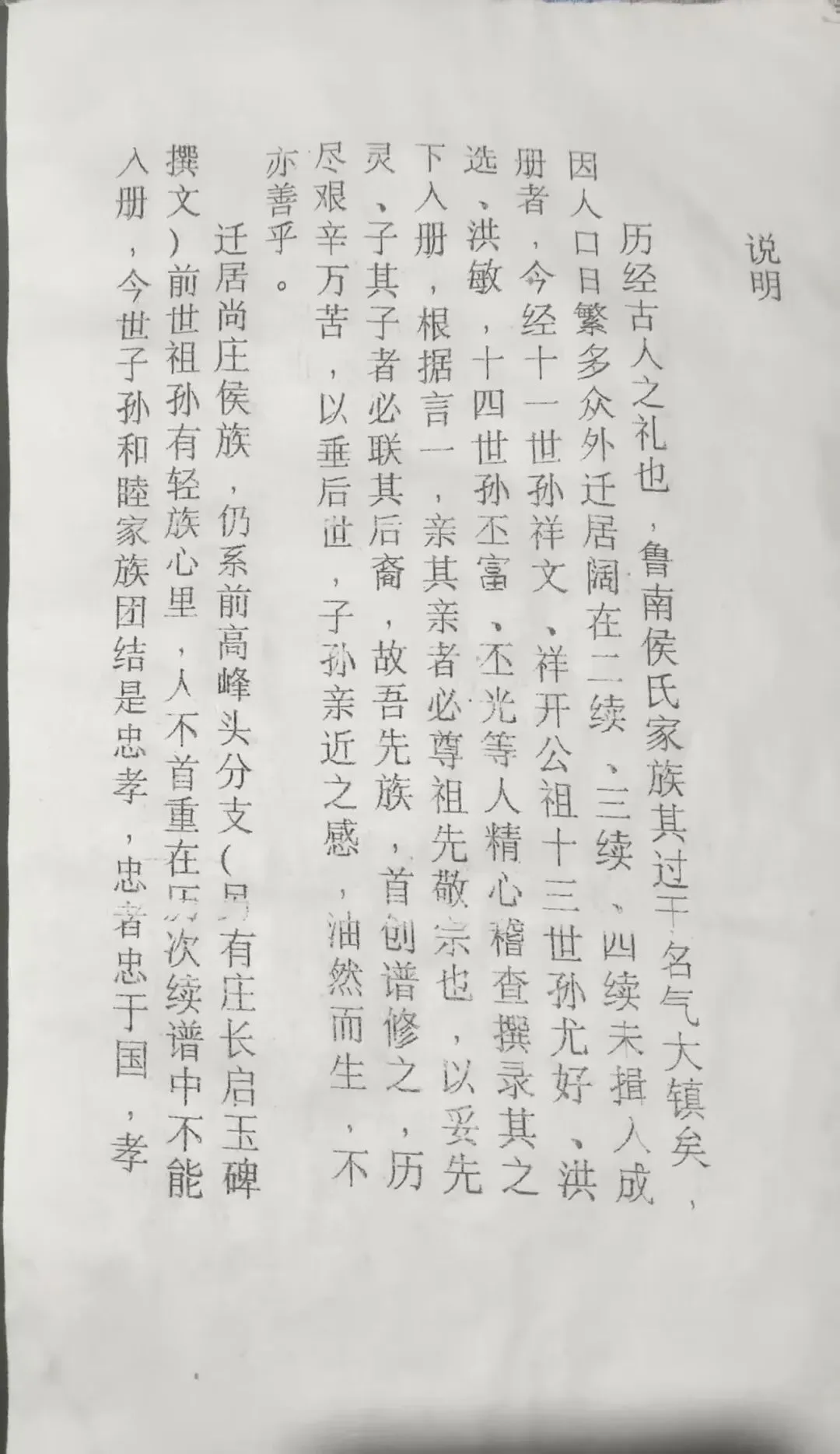 历经古人之礼也,鲁南侯氏家族其过于名气大镇矣,因人口繁多众外迁居阔,在二续、三续、四续未揖入成册者,今经十一世孙祥文、祥开公祖,十三世孙尤好、洪选、洪敏,十四世孙丕富、丕光等人精心稽查撰录其之下入册。根据言一,亲其亲者必尊祖先敬宗也,以妥先灵;子其子者必联其后裔。故吾先族,首创谱修之,历尽艰辛万苦,以垂后世,子孙亲近之感,油然而生,不亦善乎。