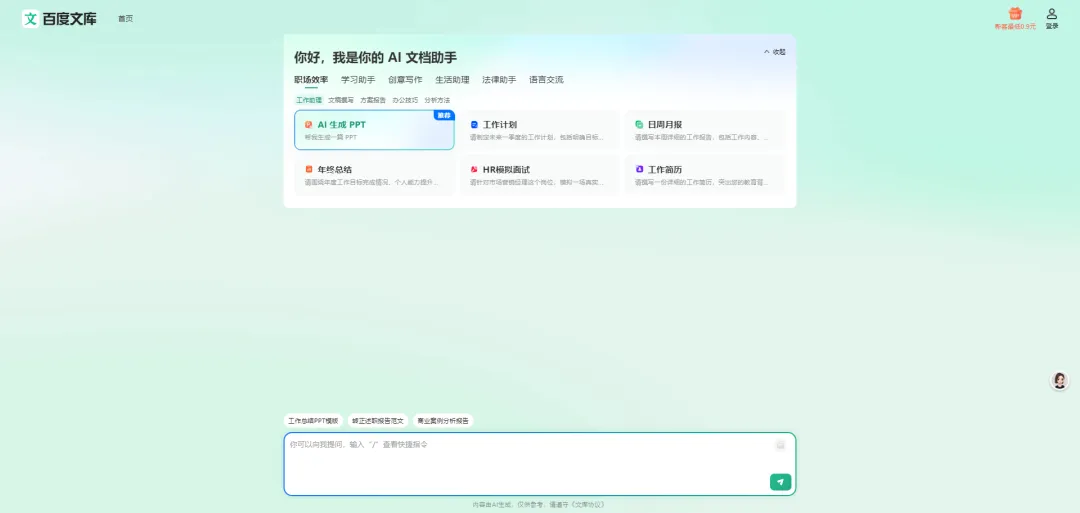 输入指令:在对话框中输入具体需求,如 “生成年终总结 PPT”“写一季度工作计划”。 -