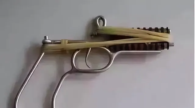 看到这个,估计不少男孩子的童年记忆要冒出来了。铁丝做骨架,皮筋缠在上面,粗看有点简陋,可小时候谁要是有一把,真能神气半天。装上火柴头,一拉一撞,“啪”一下,响声不大,却足够让一群孩子围着看。现在想想,这东西真是又土又野,但那股子手工玩具的乐趣,现在很难找回来了。
