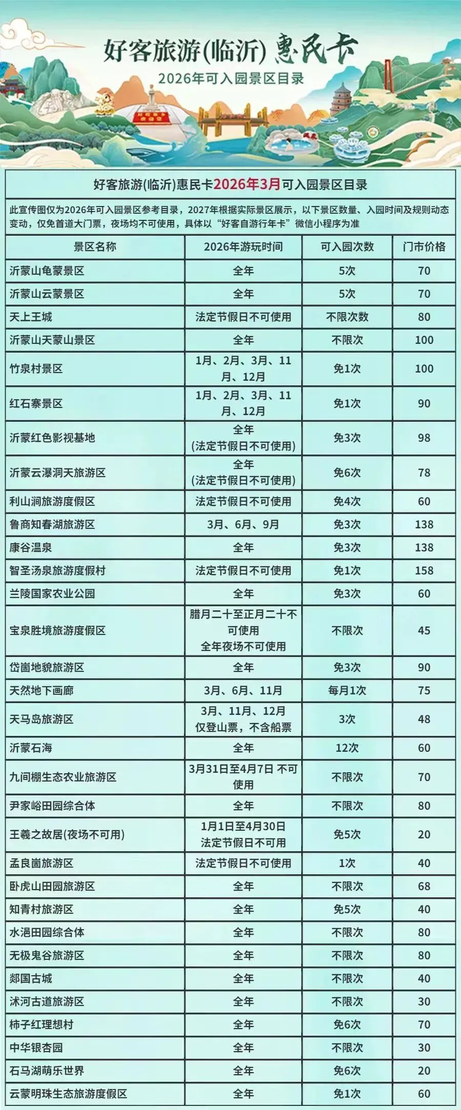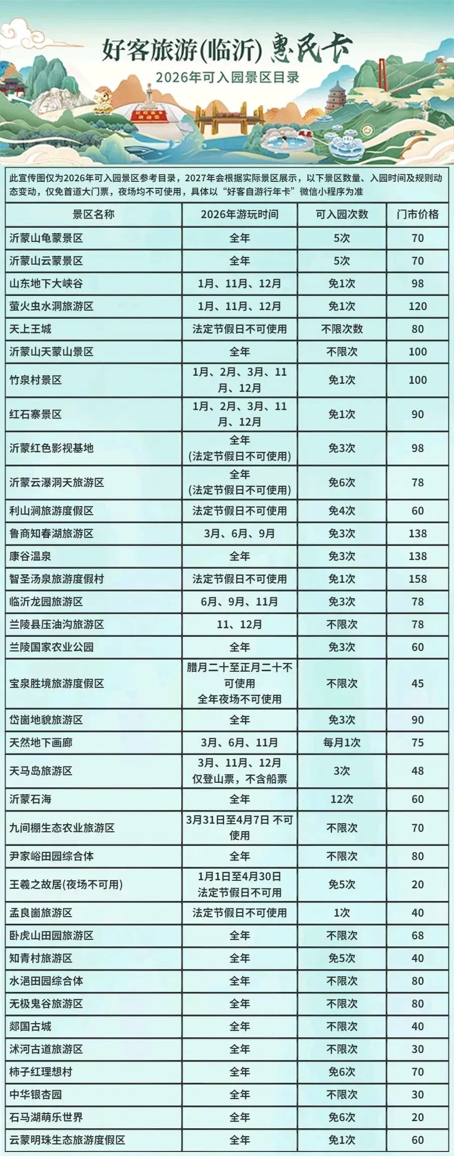 4.景区优惠政策和时令风景可关注文旅临沂和各大景区公众号查看。