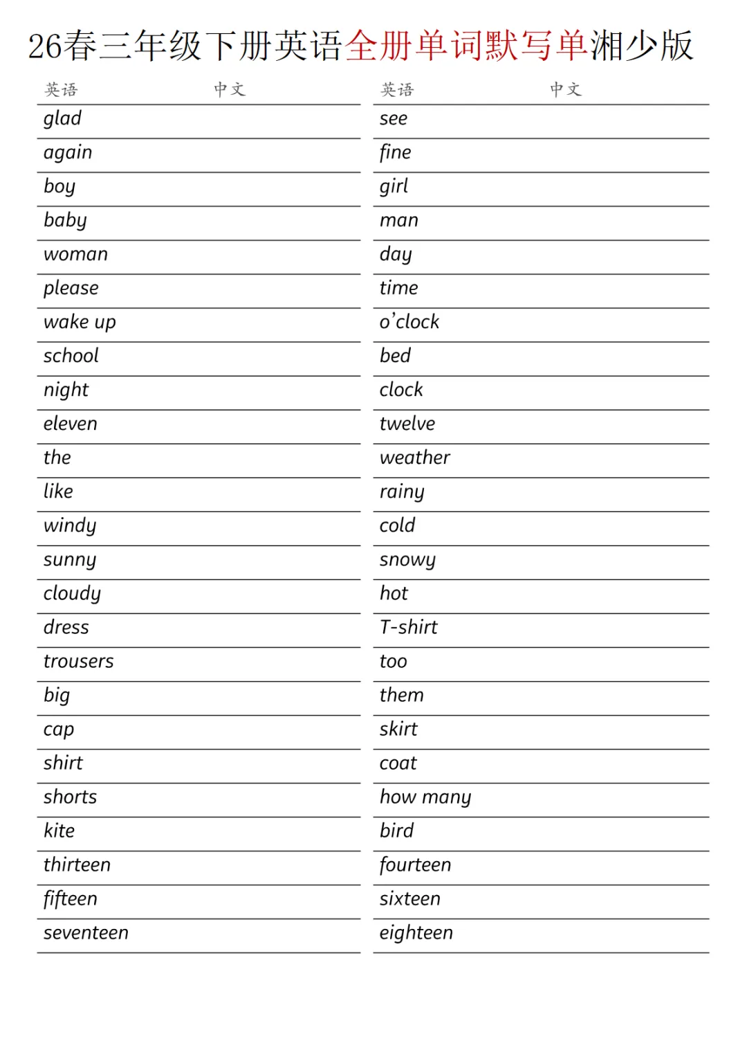 【免费下载】三年级(下)英语 26春全册单词默写单《湘少版》,PDF电子版,可打印,共4页,先保存,以免资源失效