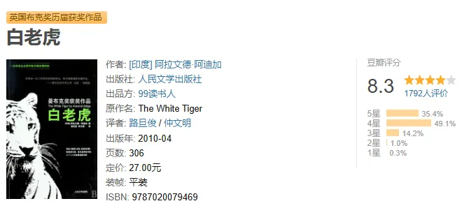 《白老虎》pdf+epub+mobi+azw3电子书下载 《白老虎》电子版下载链接,点击文章末尾左下方“阅读原文”自动跳转。 代找电子书加微:15710080257,加微备注领取电子资料可免费领取20T电子资料合集(古籍/电子书/小说/游戏/软件工具/电影/电视剧/动漫/PPT素材/教辅资料/烹饪教程/各类学习文档等电子资源)。 特别提醒:电子资料仅供个人学习使用,链接随时失效,请及时保存到个人网盘!