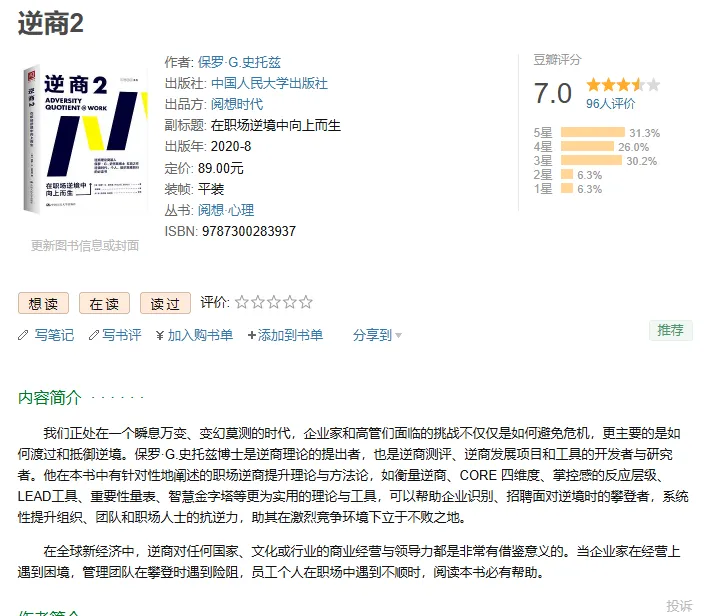 《逆商2》在职场逆境中向上而生PDF电子资料分享 点击上方蓝字 关注我,获取更多电子书分享 | 本期书单电子版下载方式见文末 ~ 作者: 保罗·G.史托兹出版社: 中国人民大学出版社出品方:阅想时代副标题: 在职场逆境中向上而生出版年: 2020-8丛书:阅想·心理ISBN: 9787300283937 特别声明:图片和资料来源于网络,版权归原作者所有,若有侵权,请联系告知,删除相关信息 本期书单电子书下载链接,点击文章末尾左下方阅读原文自动跳转。 特别提醒:电子书仅供个人学习使用,链接随时失效,请及时转存至个人网盘哦~