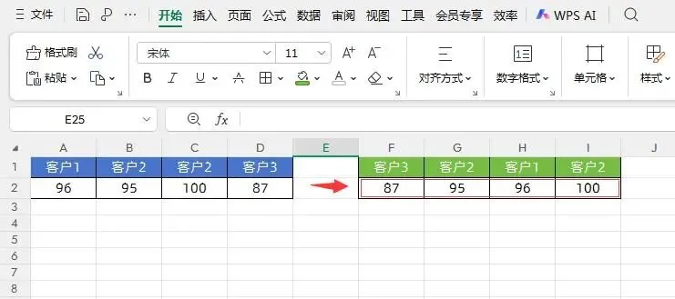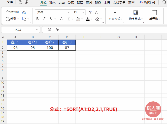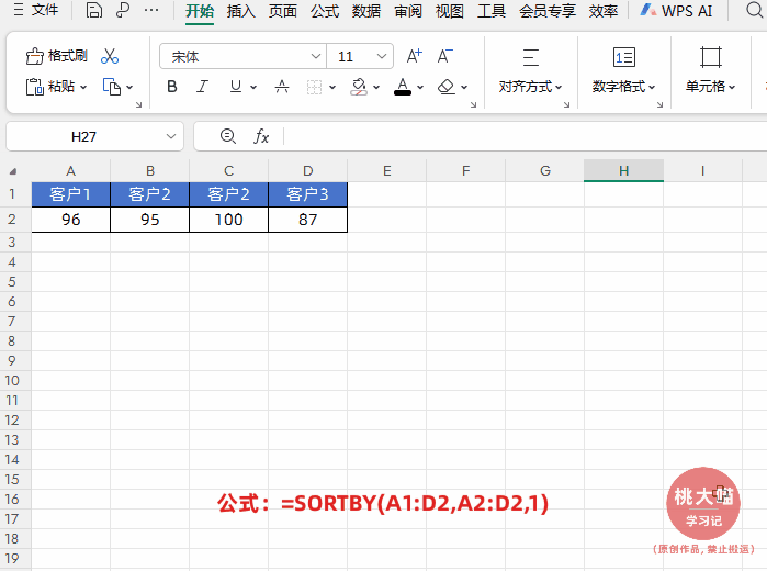 公式:=SORTBY(A1:D2,A2:D2,1)