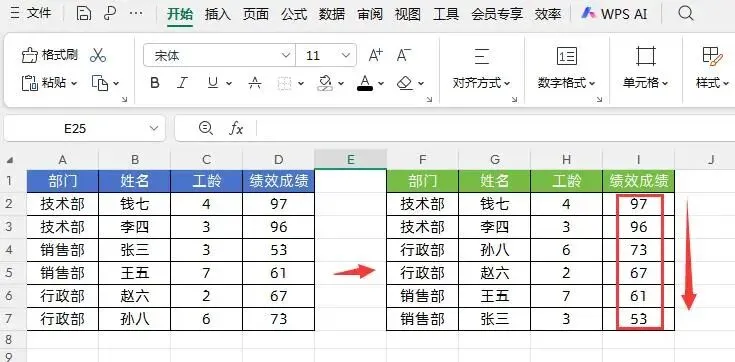 如下图所示,我们要对表格按绩效成绩降序排列。