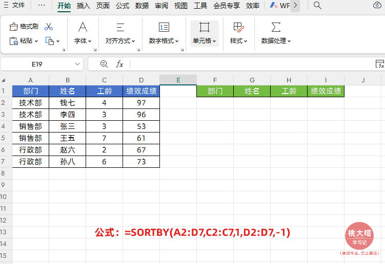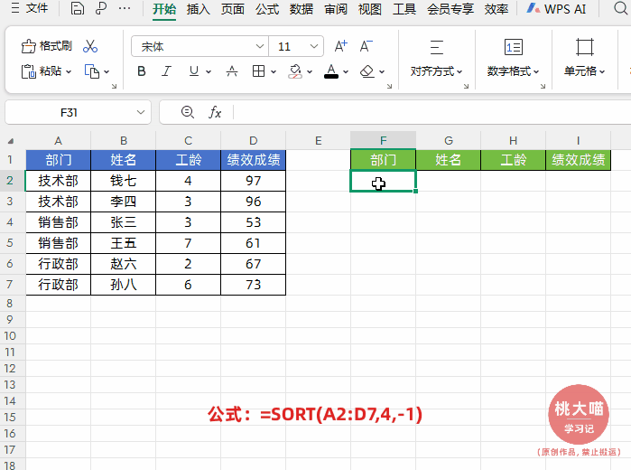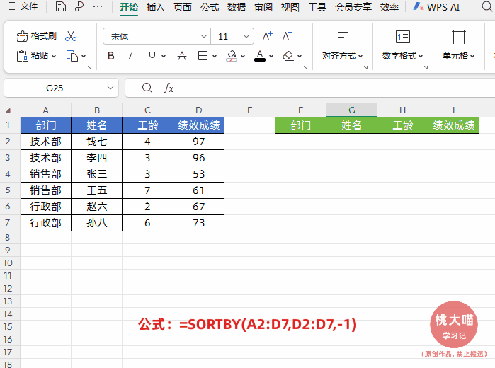 公式:=SORTBY(A2:D7,D2:D7,-1)