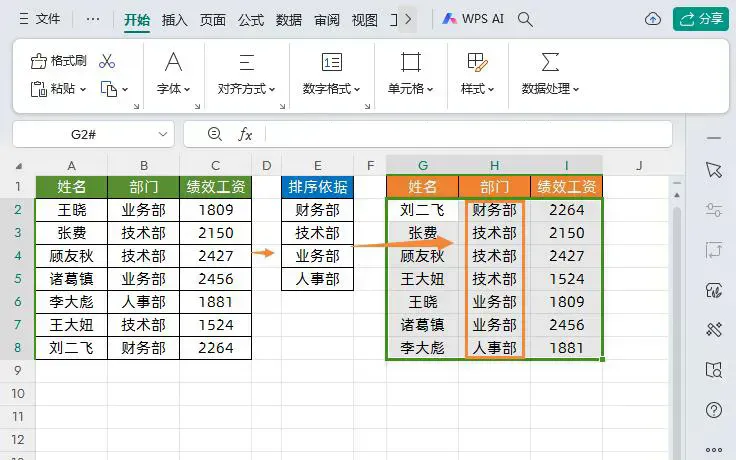 如下图所示,我们需要根据E列的部门排序依据对照表,对左侧的员工信息进行排序。