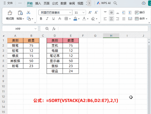先用VSTACK(A2:B6,D2:E7)合并2个表格数据,然后再使用SORT函数按数量进行升序排列。