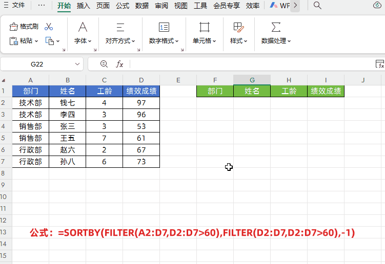 ①先利用FILTER函数筛选出绩效成绩>60的员工信息,并且返回所有信息作为第1参数数组。