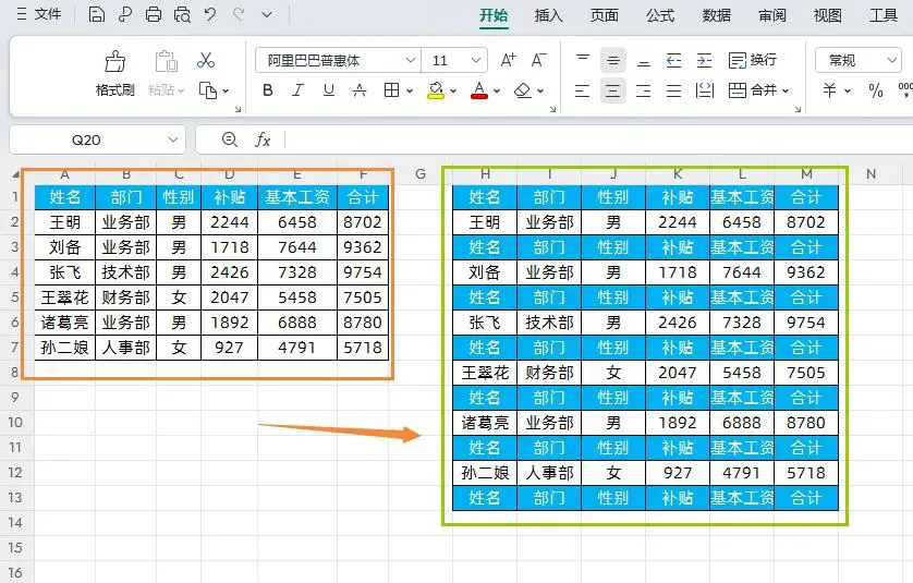 上面六个使用场景都用到了函数公式,下面我们就不利用公式,通过简单辅助列法排序,快速把工资表转成工资条。