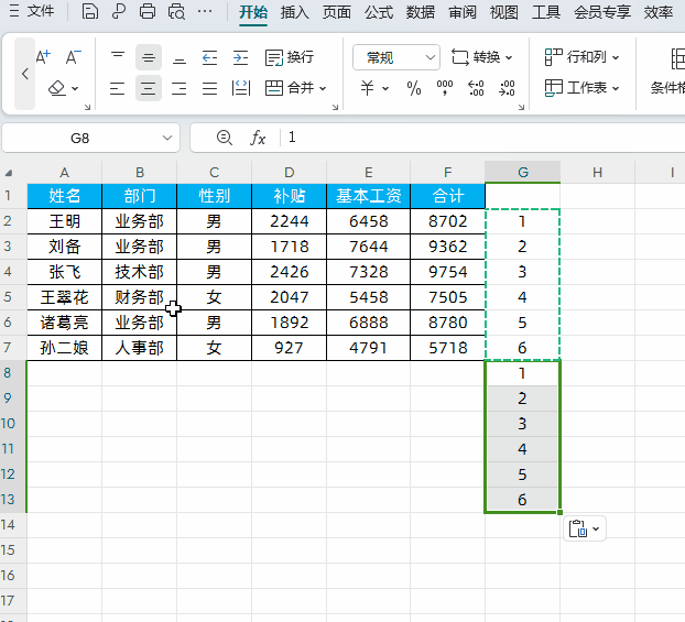 第一步、先建一个辅助列,然后输入序号批量填充(序号从工资表表头下一行开始)→然后复制序号,粘贴到已有序号的下面,如下图所示