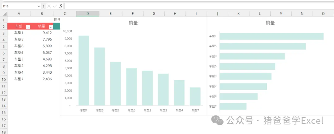 如下图所示为陈定定胡编乱造的某品牌当月各车型销量,像这么简单的数据,一般我们做出来的图表,要么是柱形图或者是条形图。