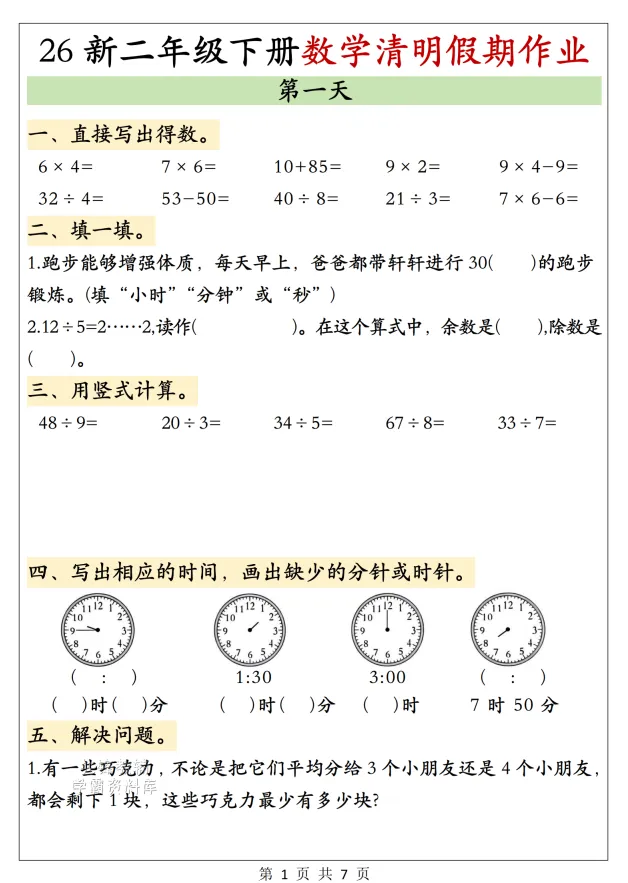 26新二年级下册数学清明假期作业,电子版可打印可下载