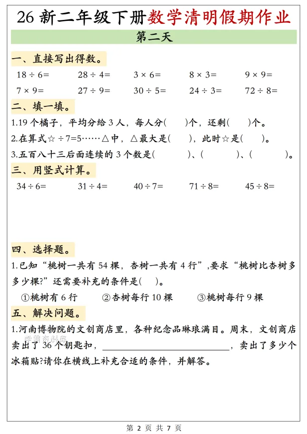 26(新版)二年级下册数学清明假期作业,电子版高清可下载可打印。因篇幅有限,仅展示部分内容。有需要的家长快给孩子领取一份,让孩子练习吧!