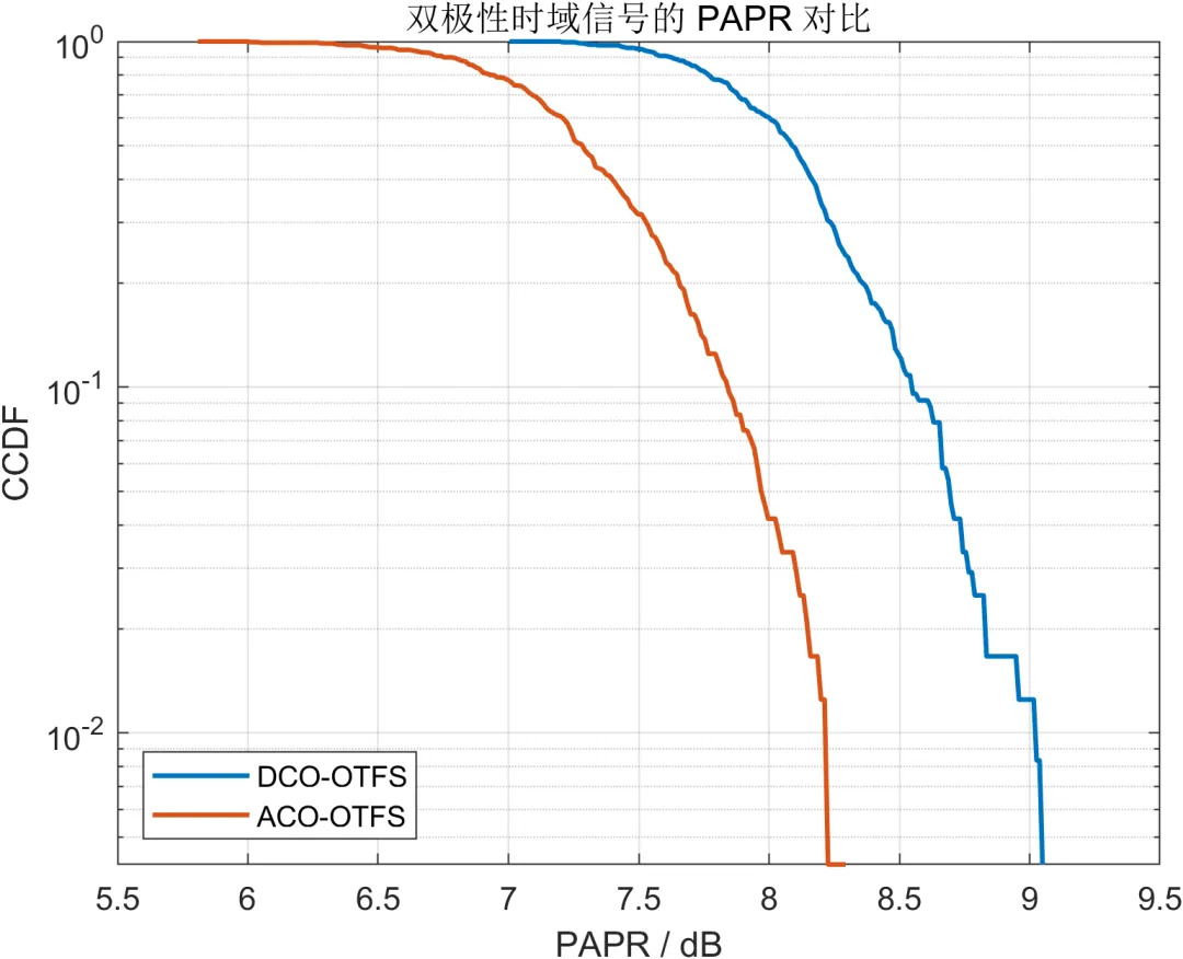 峰均比反映了发送波形的峰值与平均值之间的关系。对于多载波类系统而言,较高的峰均比会增加发射端对线性动态范围的要求,也可能加剧非线性失真。OTFS在时域中的波形特征与其二维调制结构密切相关,而单极性处理方式又进一步影响了最终发送信号的统计特性。DCO-OTFS中直流偏置的引入会改变波形平均值和峰值分布,ACO-OTFS中非对称裁剪则会形成另一种统计特性。因此,两种方案在峰均比表现上通常存在差异。