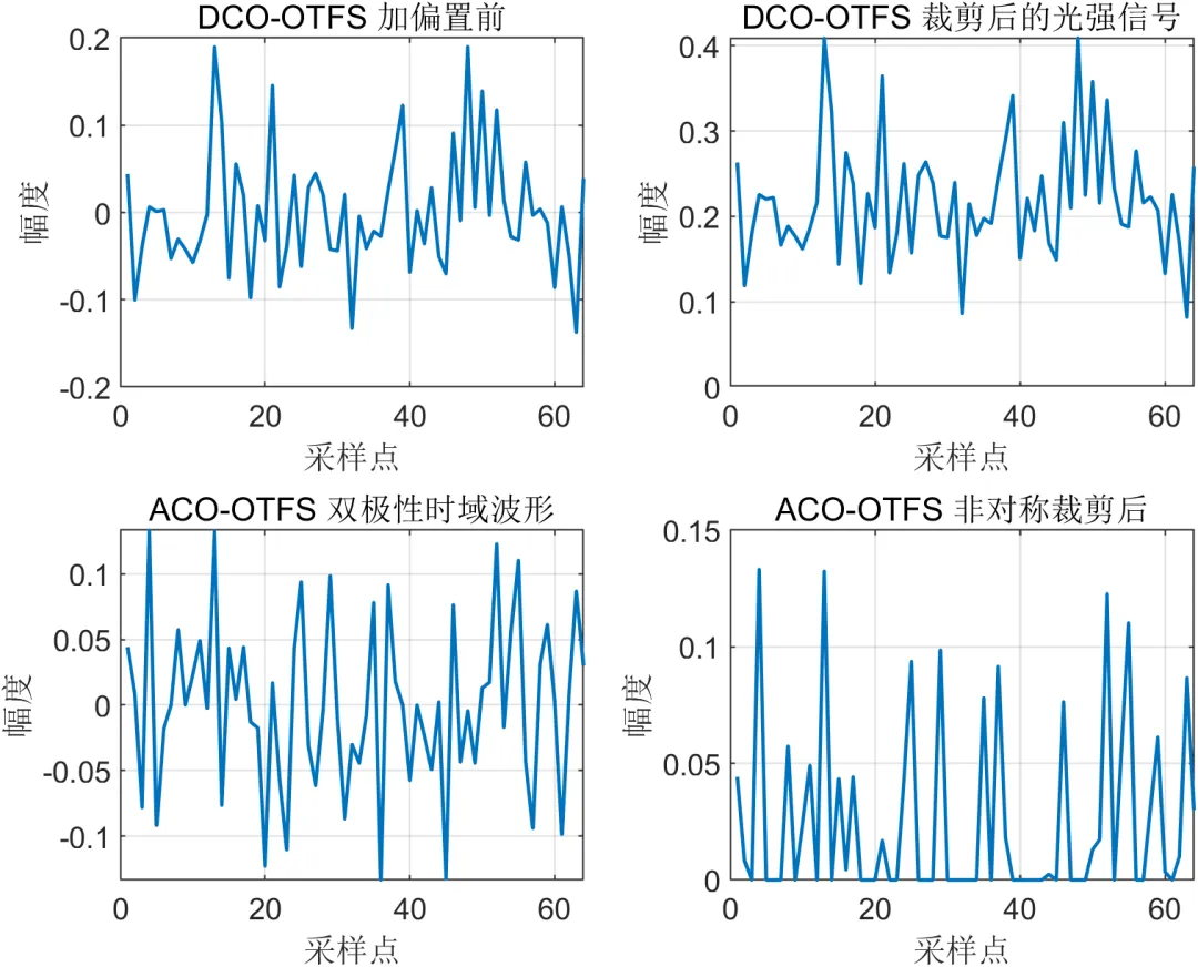 DCO-OTFS通过在双极性实值信号基础上引入直流偏置,使发送波形整体迁移到非负区间,从而满足光学传输条件。该方法结构直观,便于与传统OTFS框架衔接,且具有较高的频谱利用能力,但其不足在于直流偏置会带来额外功率消耗,当偏置不足时还可能引入裁剪失真。ACO-OTFS则通过特定的映射方式和非对称裁剪机制,将裁剪噪声限制在不承载有效信息的维度上,从而在不依赖较大直流偏置的条件下实现单极性传输。该方法在功率受限场景下具有明显优势,但其有效频谱利用率相对较低,系统吞吐能力受到一定约束。