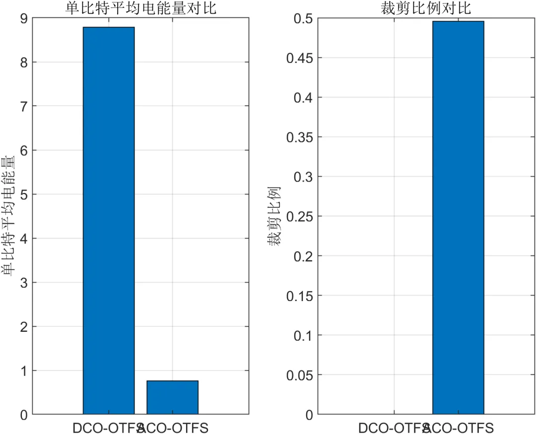 在光通信系统中,平均光功率往往是设计中的关键约束。DCO-OTFS的主要问题在于直流偏置会消耗一定比例的发射功率,而这部分功率并不直接提高有效数据承载能力。由此可见,DCO-OTFS虽然在频谱利用上表现较好,但其功率利用率并不占优。ACO-OTFS通过避免大幅度偏置,将更多发射能量集中于有效信息成分,因此在功率效率方面具有天然优势。