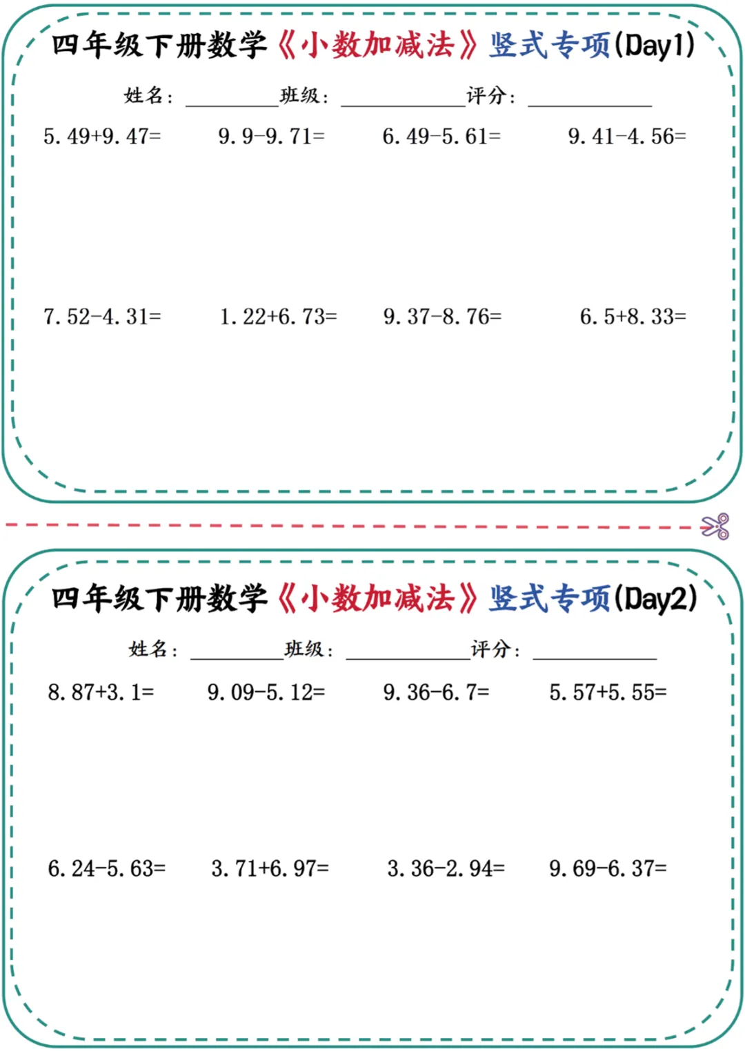 【免费下载】四年级(下)数学 《小数加减法》竖式专项,PDF电子版,可打印
