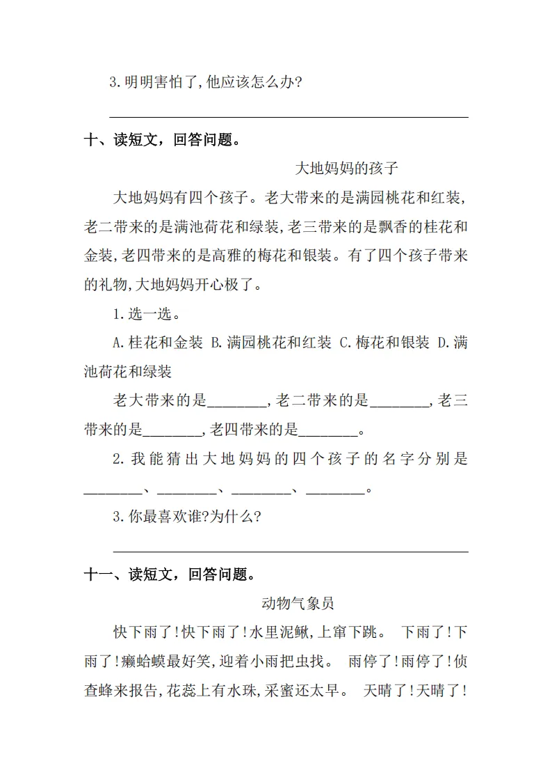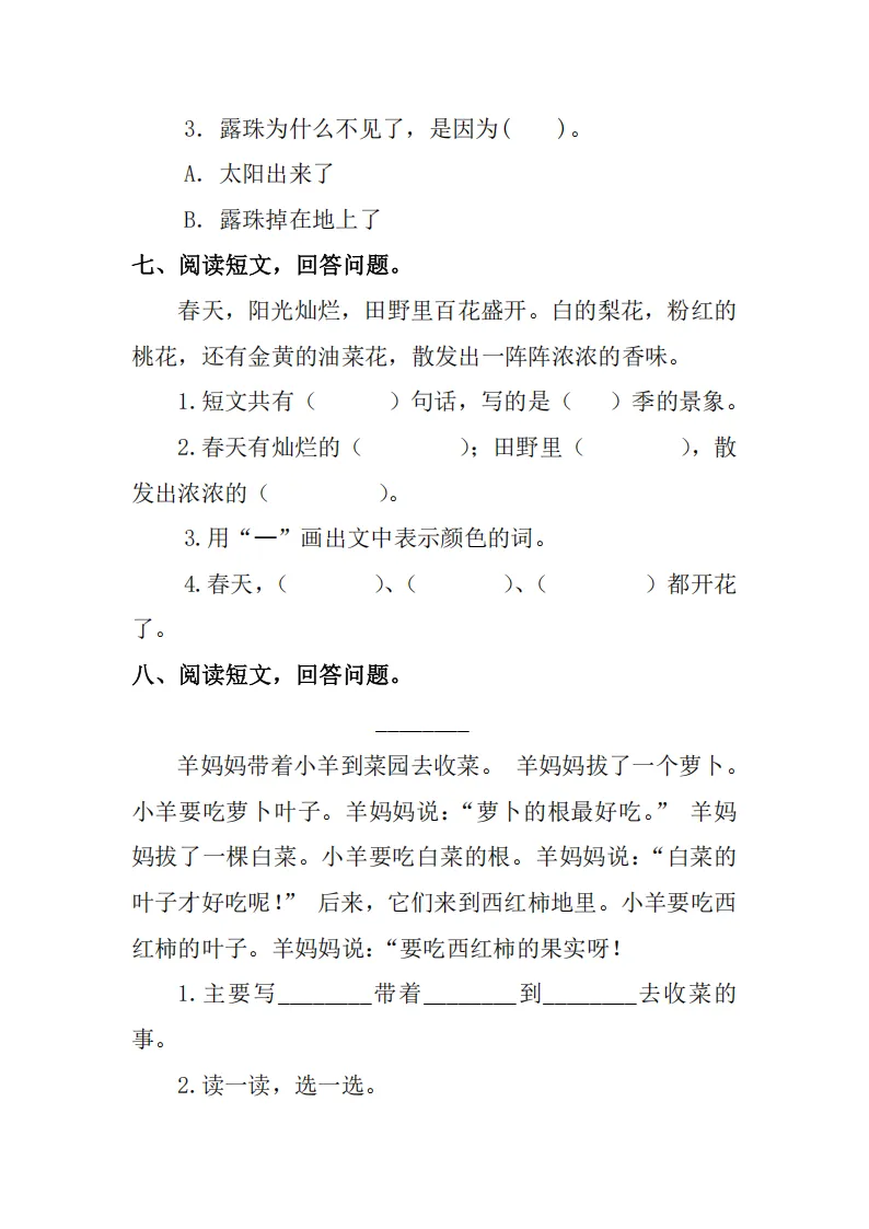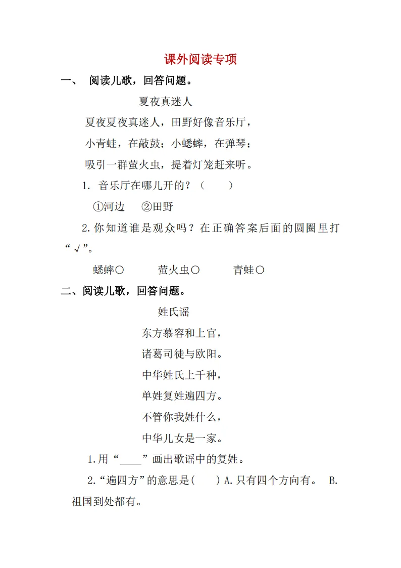 小学一年级下册语文|课外阅读专项训练(可打印)