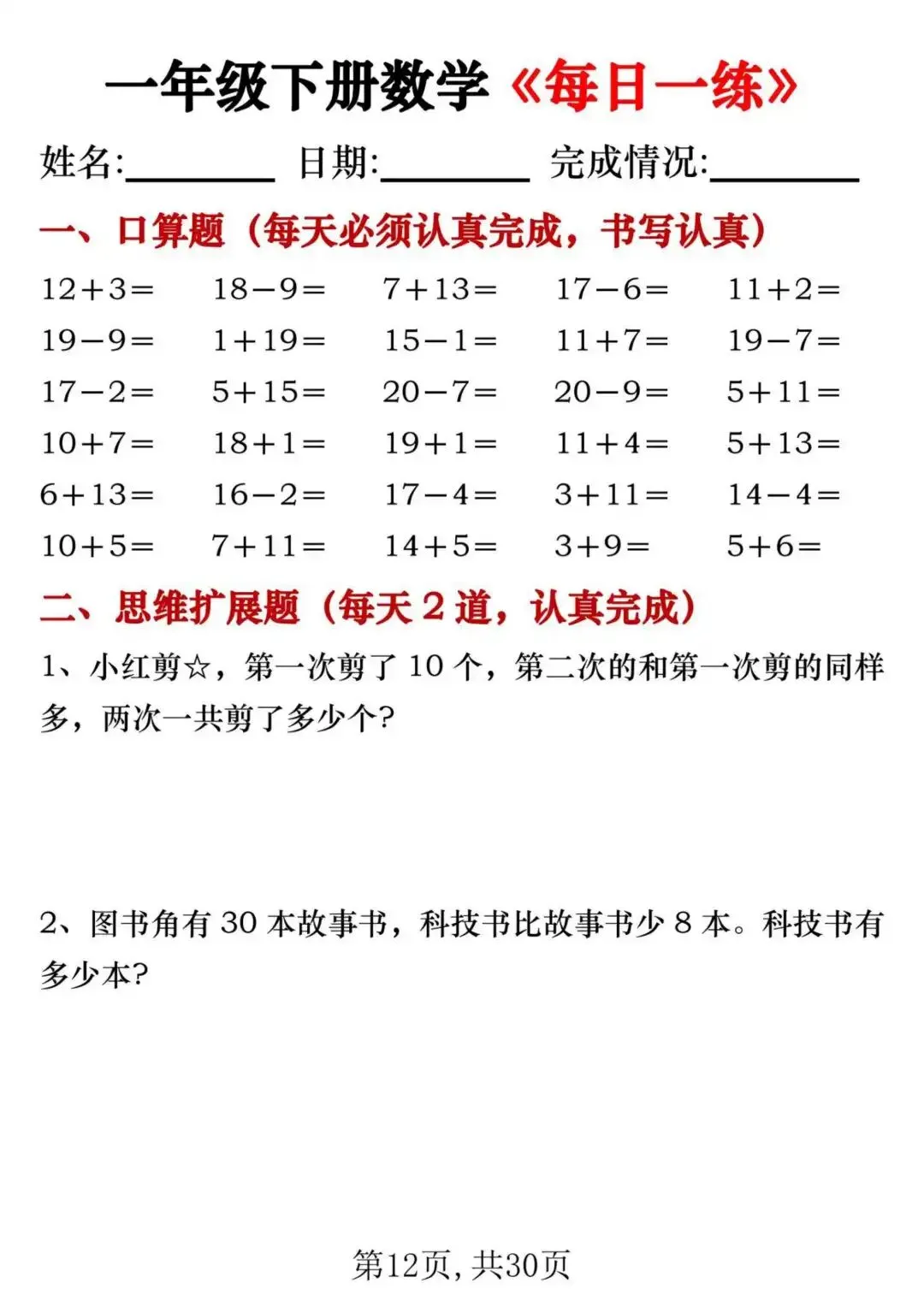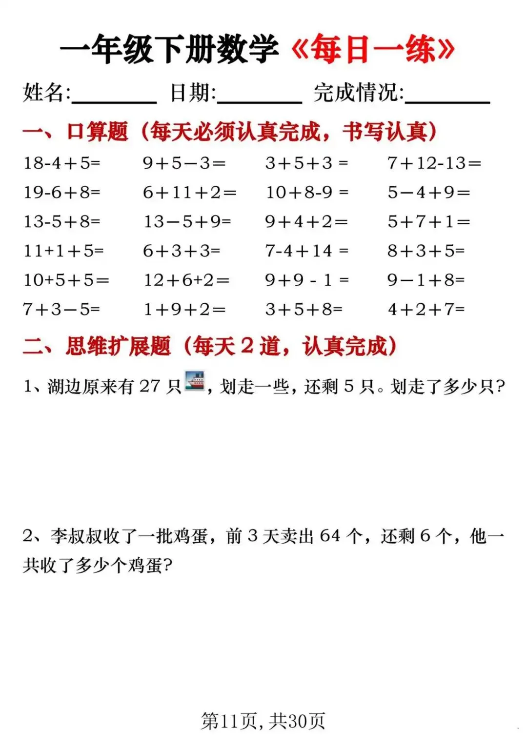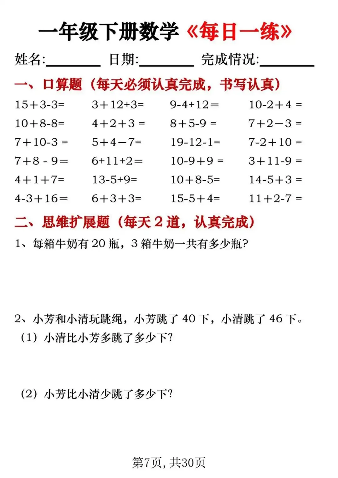 26新一年级下册数学每日一练(电子版可打印)