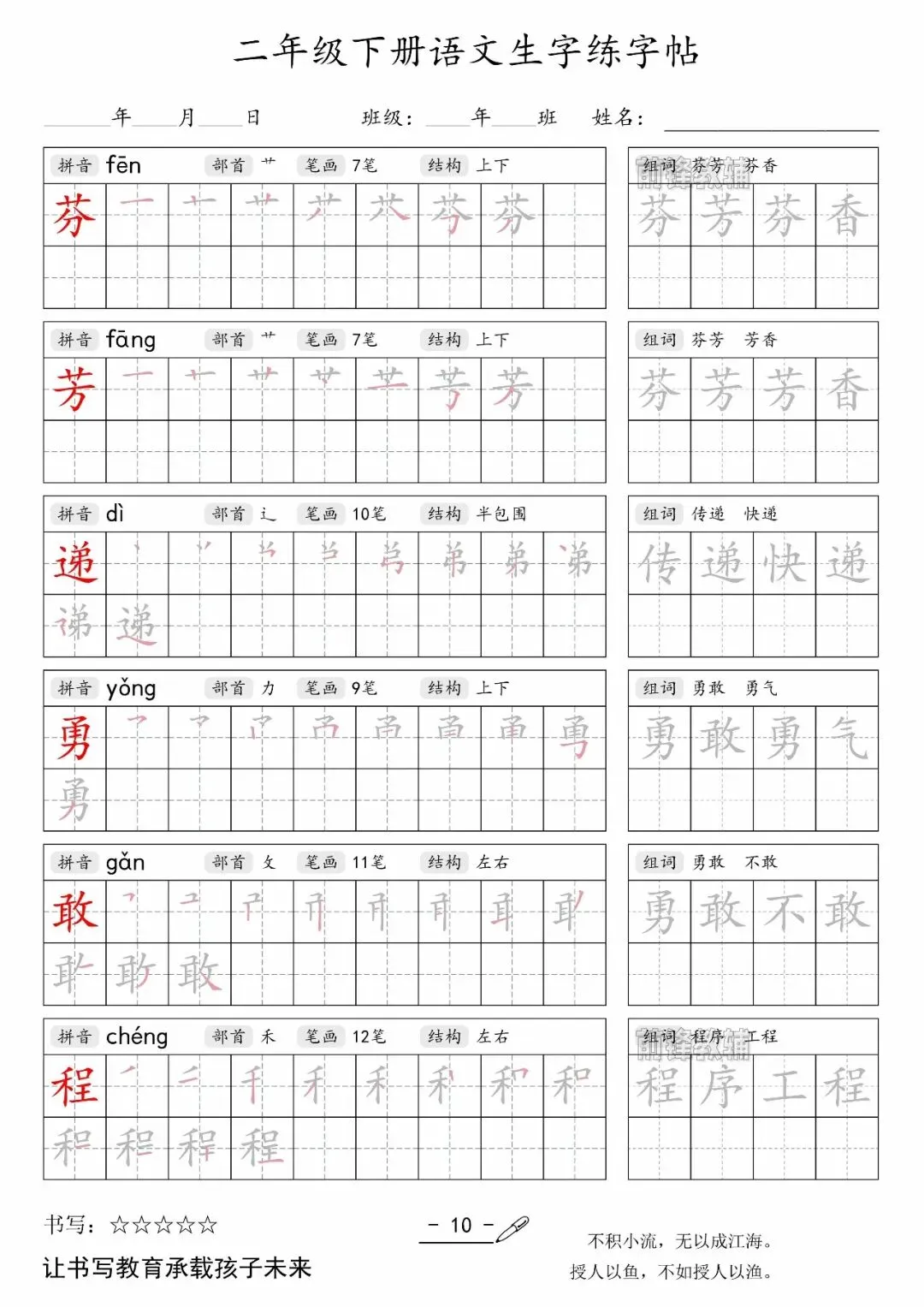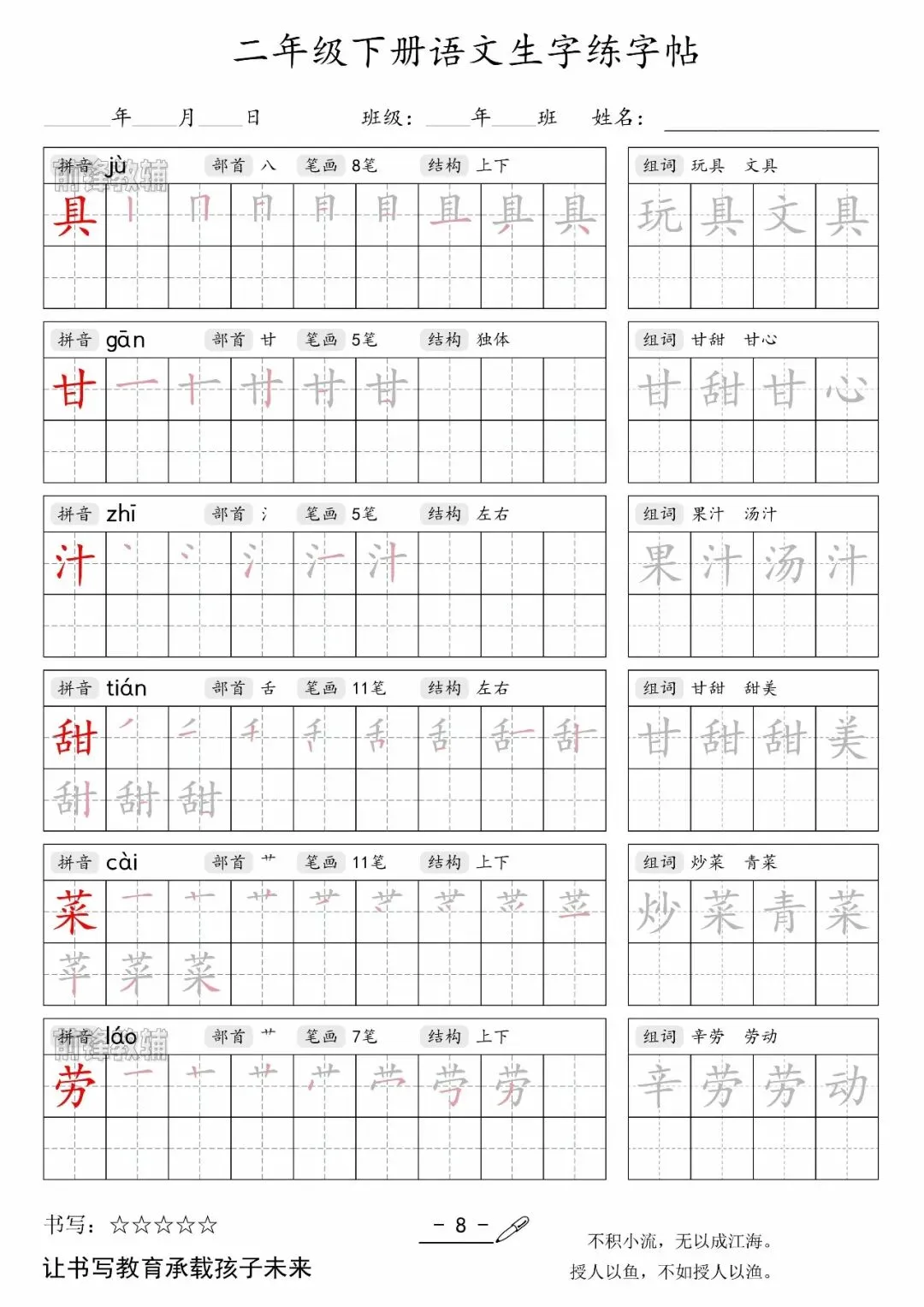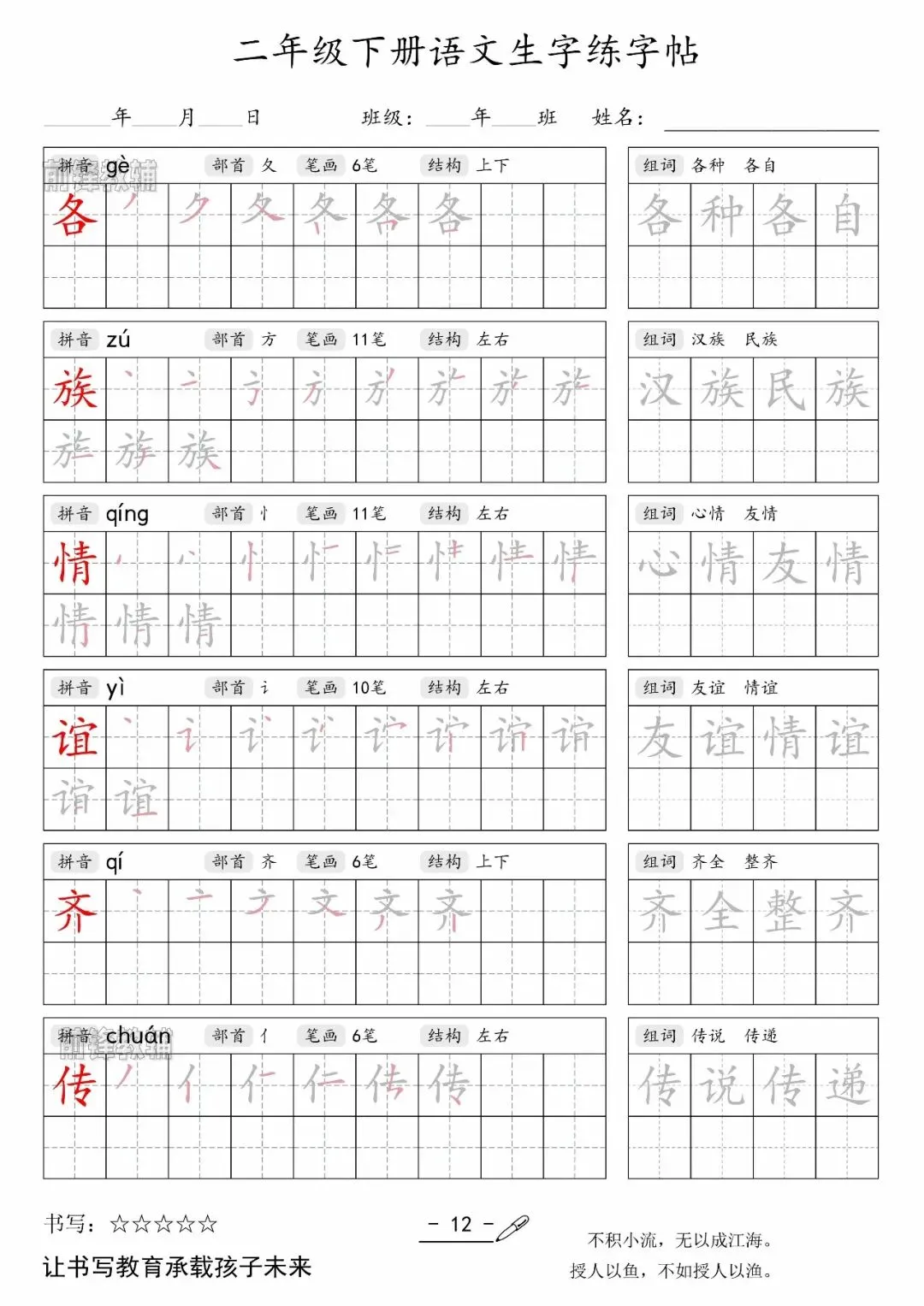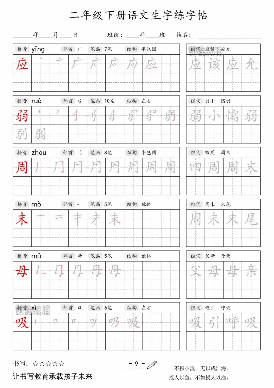 二年级下册语文生字练字帖 完整高清电子版可打印