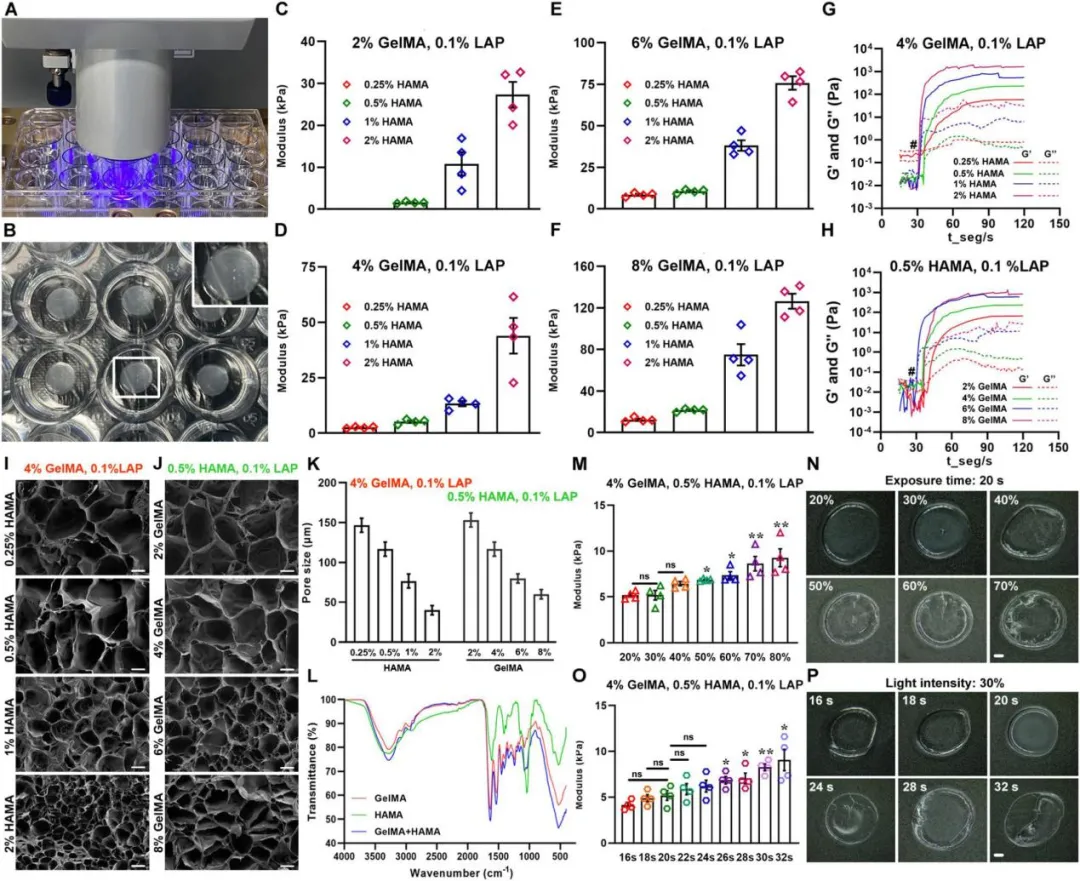 为了模拟GBM的天然细胞外基质成分(透明质酸含量较高),选择HAMA和GelMA制备生物墨水。通过一系列实验系统评估不同浓度组合HAMA和GelMA生物墨水的力学性能、黏度和形貌特征,确定符合GBM组织刚度范围和适宜细胞生长的最佳浓度组合为0.5% HAMA,4% GelMA,0.1%LAP。通过优化光固化3D生物打印过程中光照强度和曝光时间,确定最佳的打印条件。