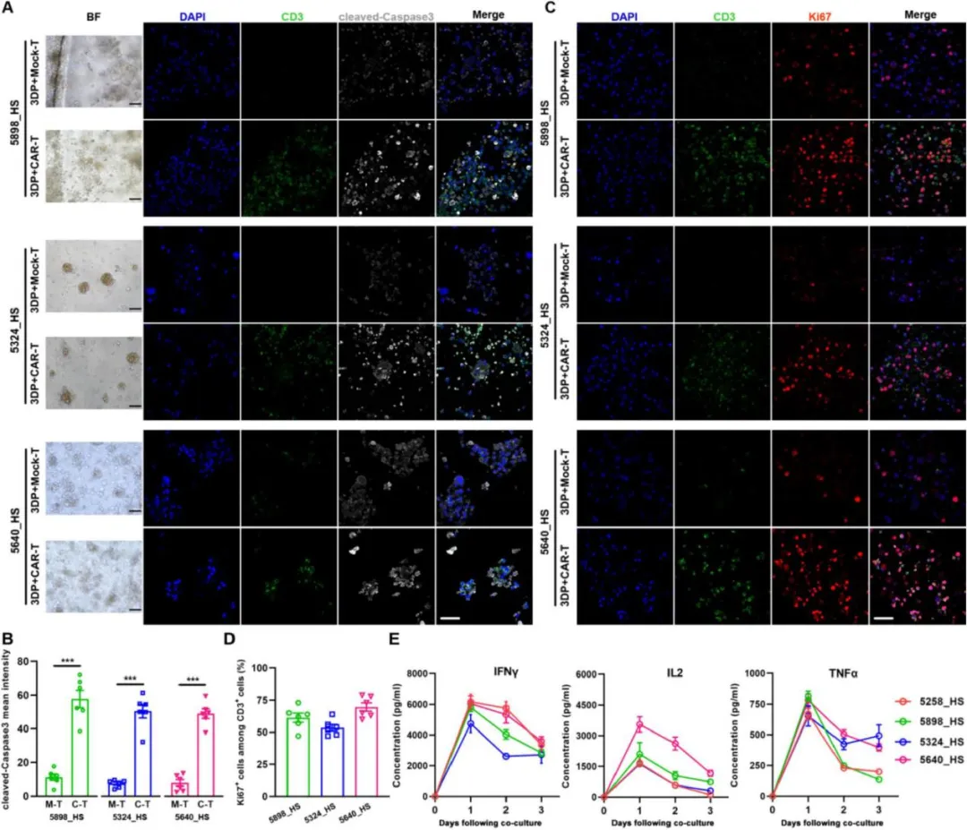 将GBM 3D模型与特异性表达GBM靶抗原的CAR-T细胞共培养,检测T细胞增殖、肿瘤细胞死亡、EGFR/EGFRvIII抗原丢失以及细胞因子释放。与Mock-T细胞相比,在CAR-T细胞处理的GBM 3D模型中,表达CD3的T细胞均为Ki67+,表明有大量的T细胞增殖。同时,表达EGFR +和EGFRvⅢ+ +的肿瘤细胞Caspase3信号显著增强,表明CAR-T细胞对肿瘤细胞的靶向杀伤作用。ELISA检测到细胞因子IFNγ、IL2和TNFα的释放显著升高。其中,T细胞的激活强度与肿瘤细胞靶抗原的表达呈正相关。低表达EGFR的模型(5258和5898),其TNFα的释放水平也较低;而高表达EGFR的模型(5324和5640)在共培养中TNFα的含量更高。结果表明,GBM 3D模型在快速评估抗原特异性CAR-T细胞治疗反应中的应用价值。