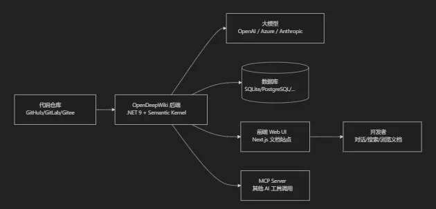 flowchartLR A[代码仓库GitHub/GitLab/Gitee]–> B[OpenDeepWiki 后端.NET 9 + Semantic Kernel]B –> C[大模型OpenAI / Azure / Anthropic]B –> D[(数据库SQLite/PostgreSQL/…)]B –> E[前端 Web UINext.js 文档站点]E –> F[开发者对话/搜索/浏览文档]B –> G[MCP Server其他 AI 工具调用]