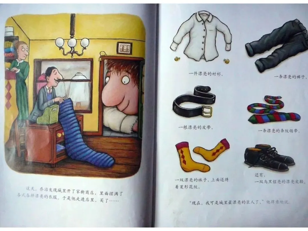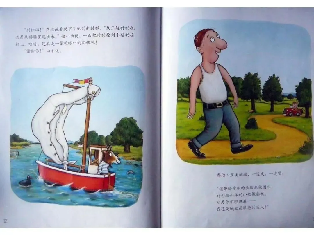 乔治心里美滋滋,一边走,一边唱:“领带给受冻的长颈鹿做围巾,衬衫给山羊的小船做船帆,可是你们瞧瞧我——我还是城里最漂亮的巨人!”