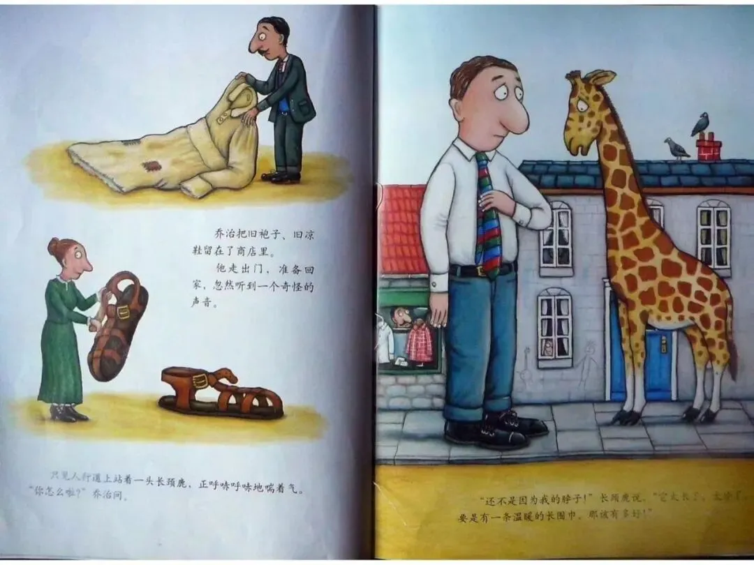 “别担心!” 乔治说着解下了他的条纹领带。“反正这领带跟我的袜子也不相配。他一面说一面把领带一圈一圈地围在长颈鹿的脖子上。