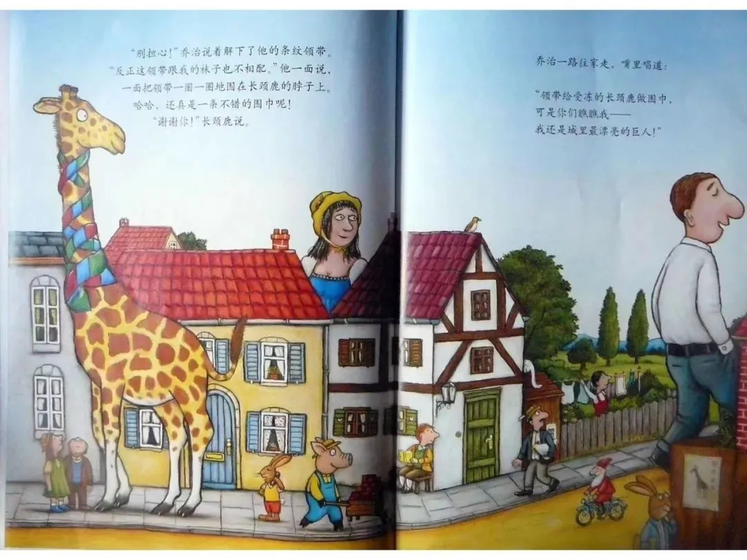乔治一路往家里走,嘴里唱道:“领带给受冻的长颈鹿做围巾,可是你们瞧瞧我——我还是城里最漂亮的巨人!”