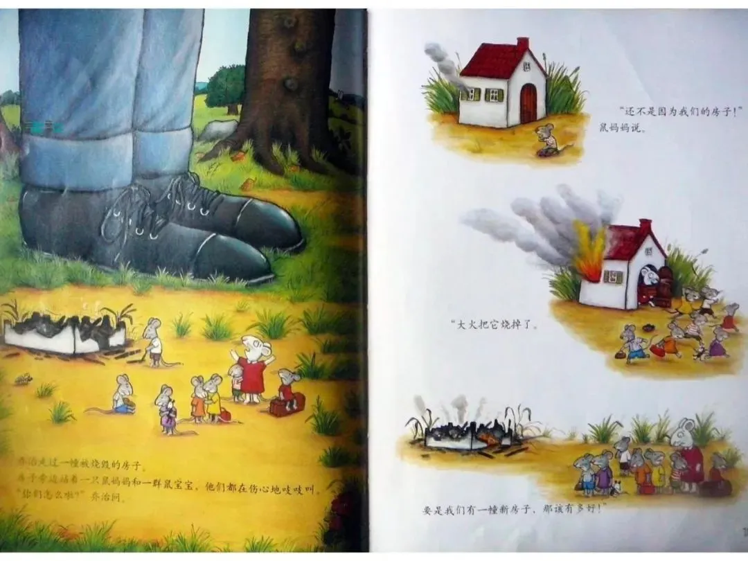 “你们怎么啦?”乔治问。“还不是因为我们的房子!”鼠妈妈说。“大火把它烧掉了。要是我们有幢新房子,那该多好!”