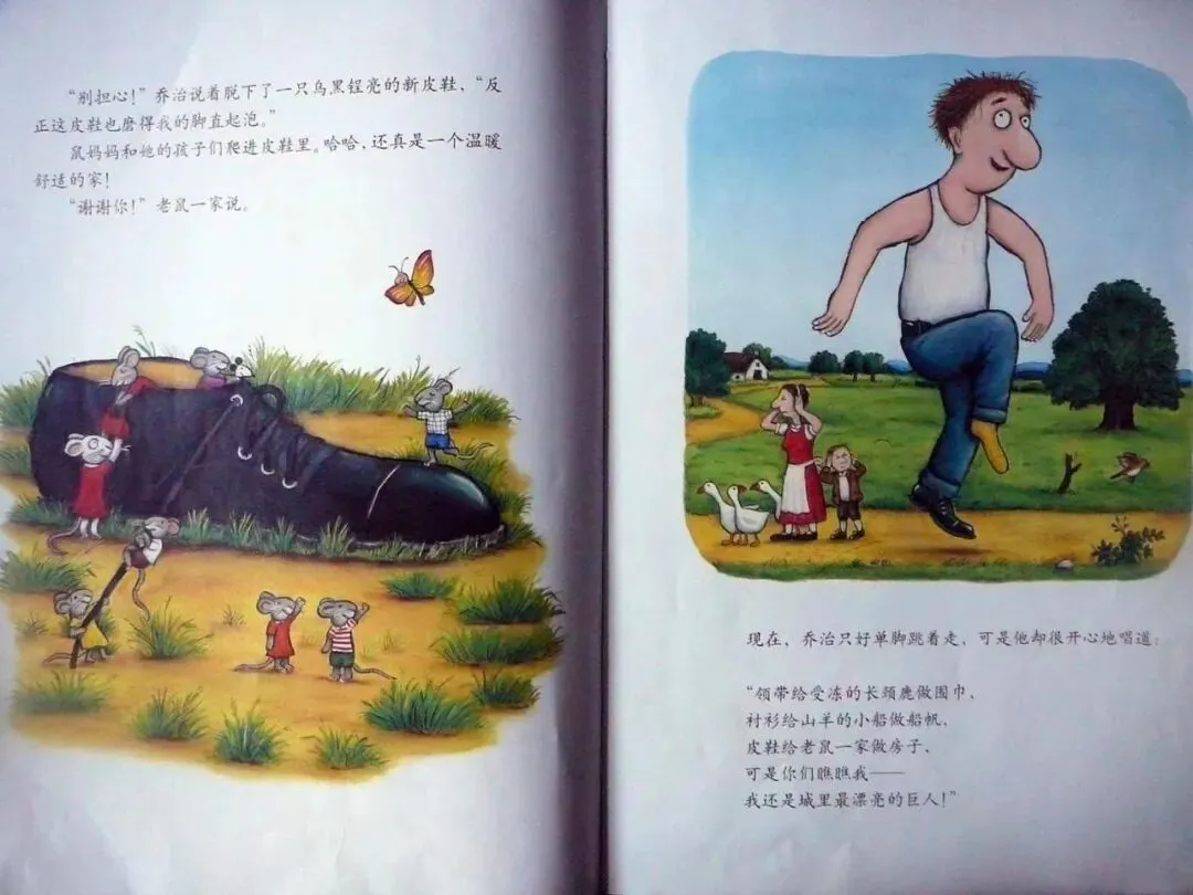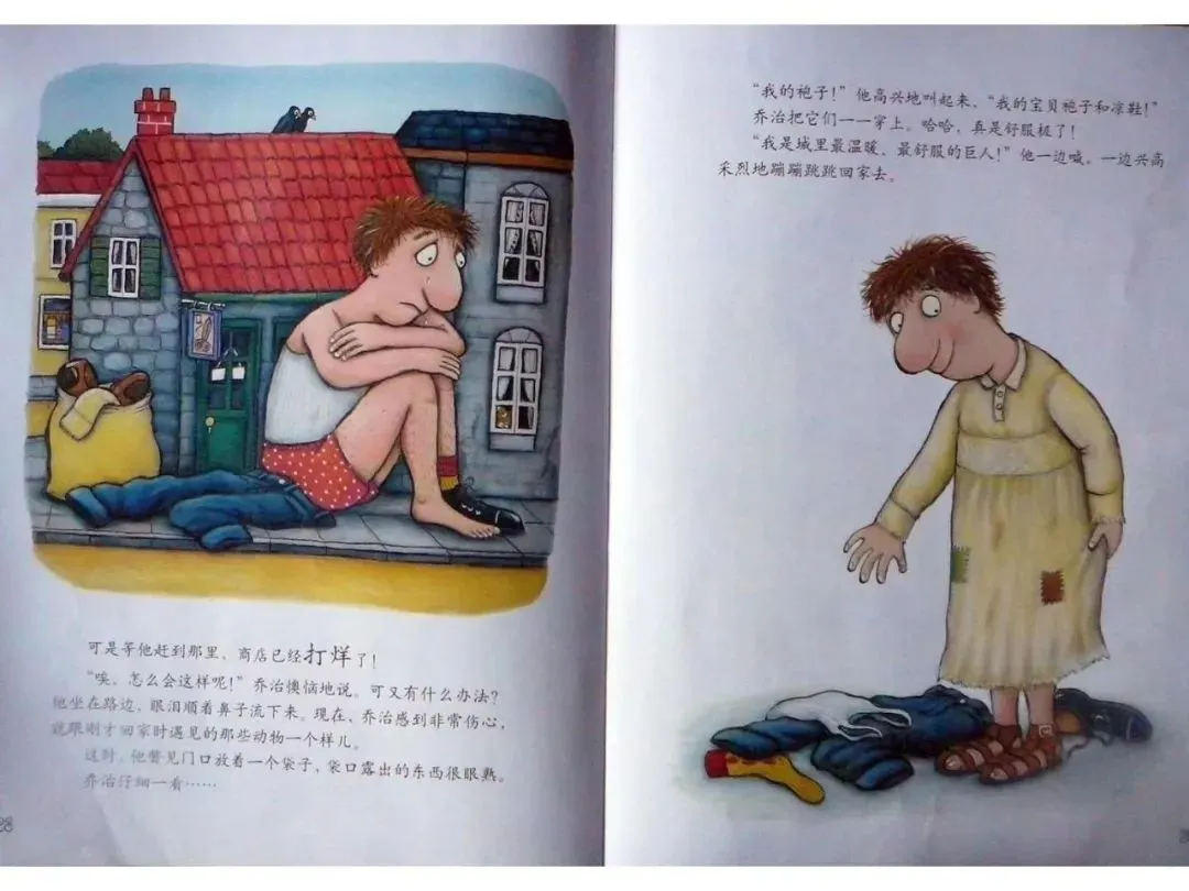 哈哈,还真是一个温暖舒适的家!“谢谢你!”老鼠一家说。现在,乔治只好单脚跳着走,可是他却很开心地唱道:“领带给受伤的长颈鹿做围巾,衬衫给赡养的小船做船帆,皮鞋给老鼠一家做房子,可是你们瞧瞧我——我还是城里最漂亮的巨人!”