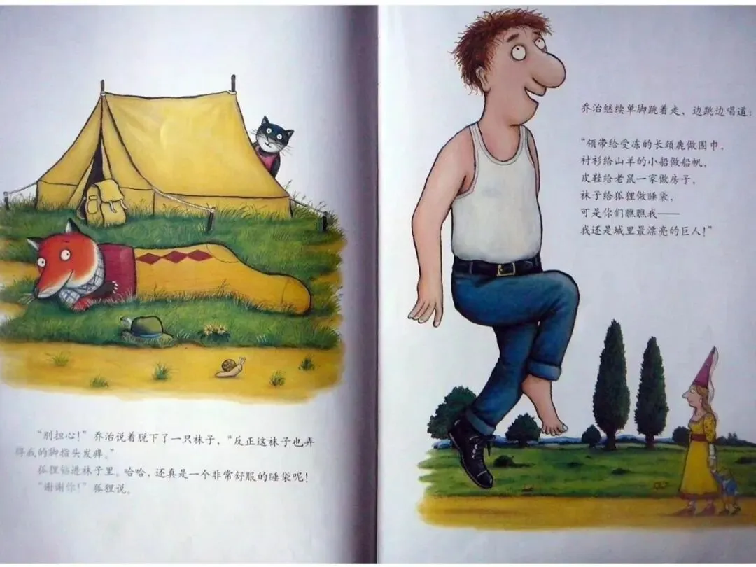 乔治继续单脚跳着走,边跳边唱道:“领带给受冻的长颈鹿做围巾,衬衫给山羊的小船做船帆,皮鞋给老鼠一家做房子,袜子给狐狸做睡袋,可是你们瞧瞧我——我还是城里最漂亮的巨人!”