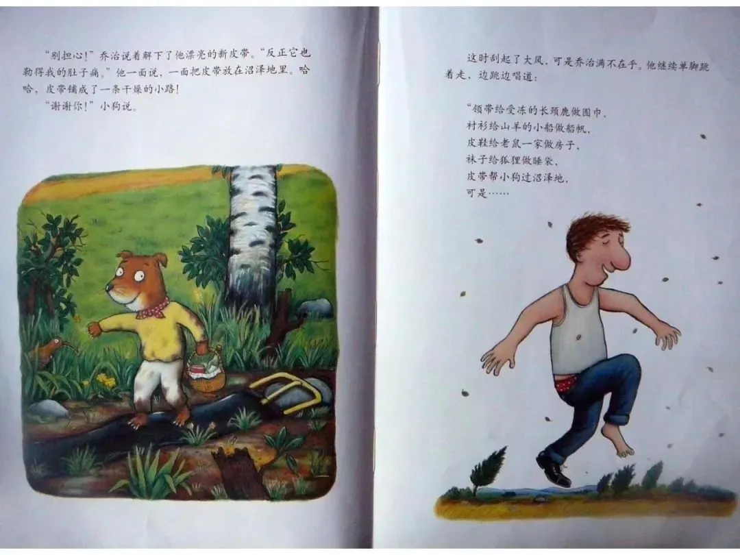 这时刮起了大风。可是乔治满不在乎。他继续单脚跳着走,边跳边唱到:“领带给受冻的长颈鹿做围巾,衬衫给山羊的小船做船帆,皮鞋给老鼠一家做房子,袜子给狐狸做睡袋,皮带帮小狗过沼泽地,可是……”