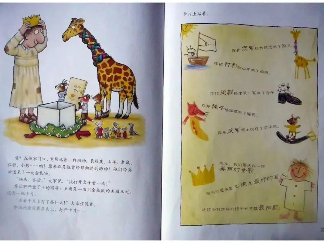 乔治是个巨人,城里最邋遢的巨人。他总是穿着同一双黄色的旧凉鞋,同一件打着补丁的旧袍子。然而,乔治却有一顶美丽的金冠,这是他曾经帮助过的动物送给他的礼物。因为他是城里最最心眼儿好的巨人,也是城里最快乐的巨人。那么,乔治这样一个邋遢的巨人到底是怎样帮助别人的?他又是如何在帮助被人的同时收获快乐的呢。
